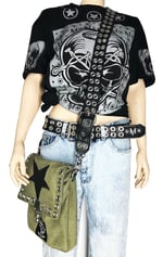 Due to an overwhelming demand for this bag we are dropping pricing to make the last few more available to the MV Army! Measurements are roughly 10" x 10" with a long cross body all chrome grommeted adjustable black leather strap. This bag also features those cool chrome grommets around the bag flap. These are not your cheap aluminum eyelets they are metal chrome and backed for that super clean look and chunky feel!